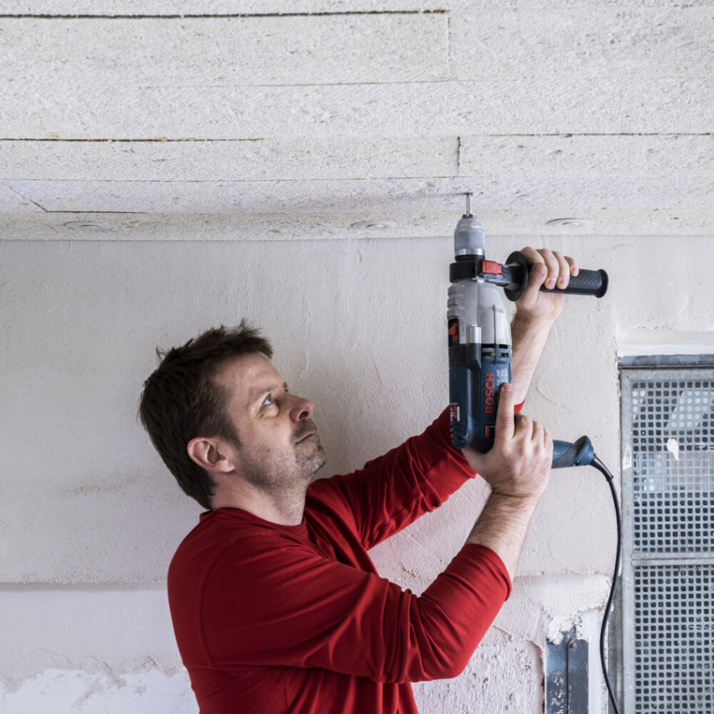 La vis pour isolation de plafond de cave DDS est vissée directement dans le plafond en béton sans autres chevilles. Le diamètre du trou est de 6 mm pour ce Produit. Pour cela, tu as besoin d'une visseuse sans fil puissante de 14 volts, voire de 18 volts.