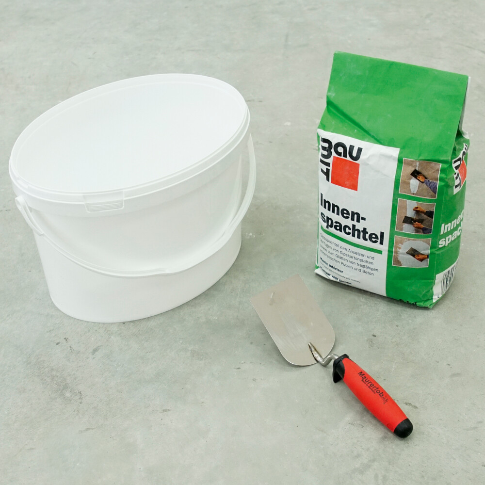 Pour préparer l'Enduit de lissage intérieur Baumit, il vous faut un seau propre, une spatule de stucateur et de l'eau. Eventuellement aussi un gobelet gradué pour mesurer l'eau.
