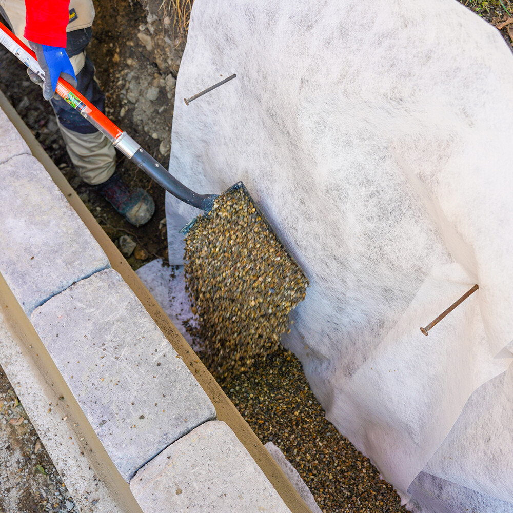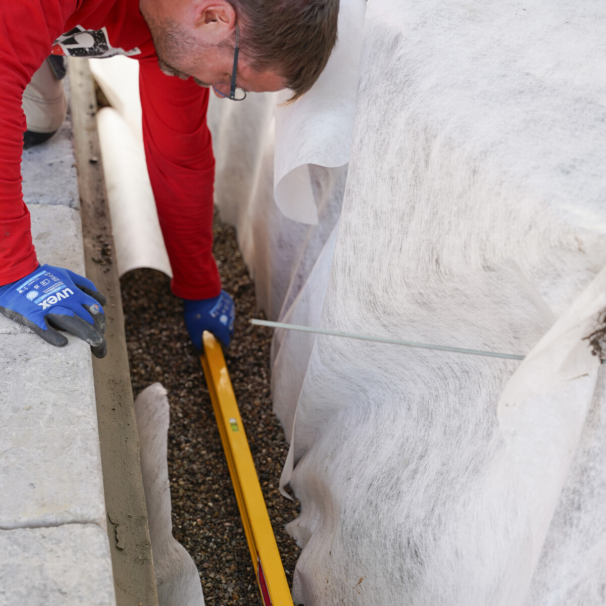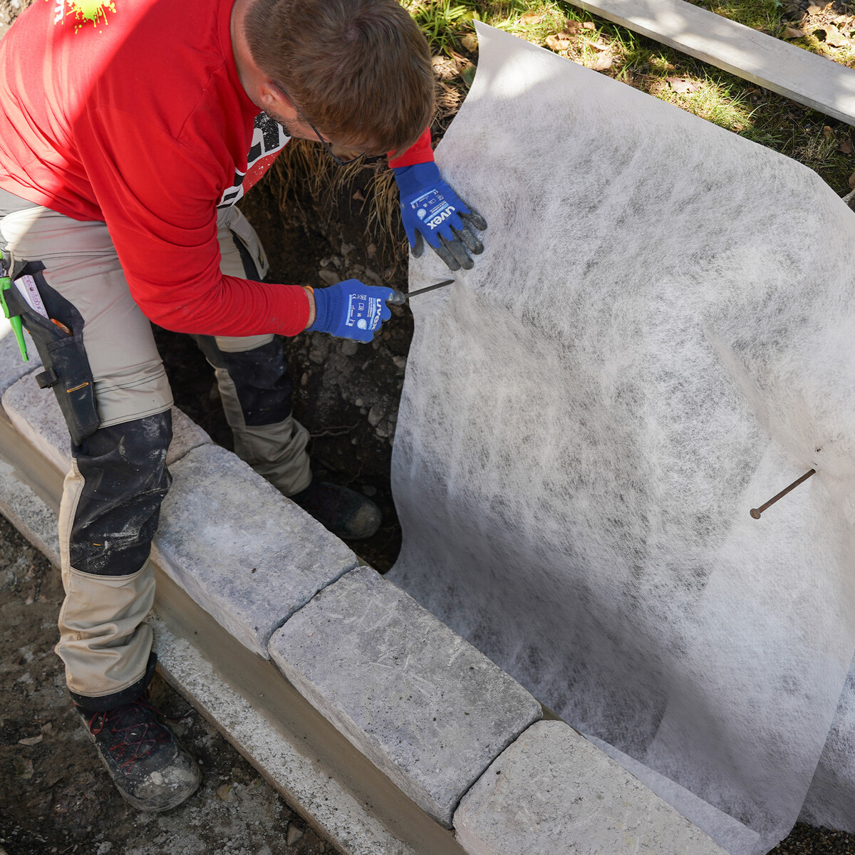 Nachdem du die Grube mit dem benötigten Kies befüllt hast, kannst du das Drainagevlies auf das Kiesaufbett auflegen. Dabei soll der Kies komplett mit dem Vlies ummantelt sein und das Vlies mind. 15 cm auf der Grabenwand aufliegen.