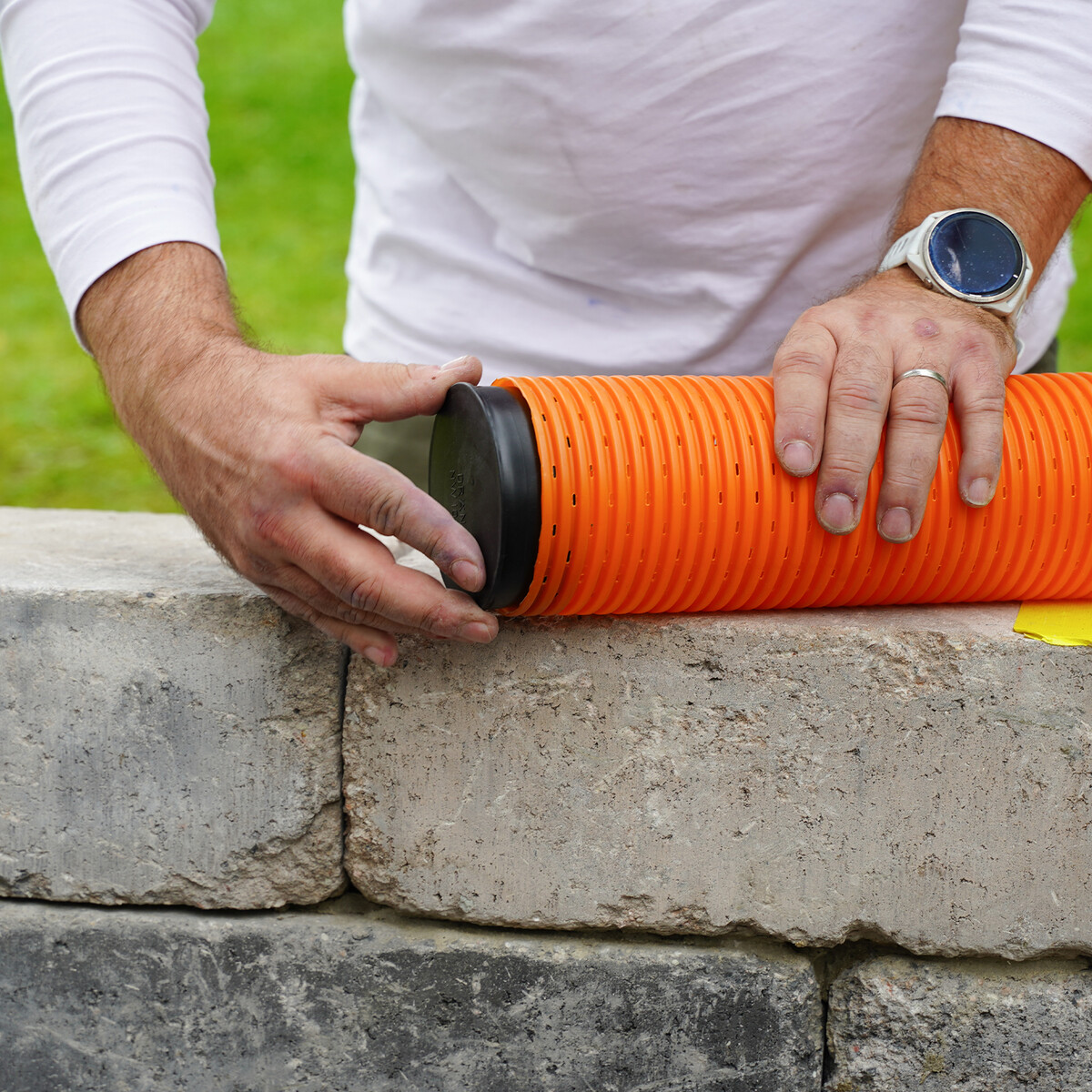 Der Abschluss eines Drainagerohrs wird mit einem zur Grösse des Drainagerohrs passenden Verschlusstopfen verschlossen.