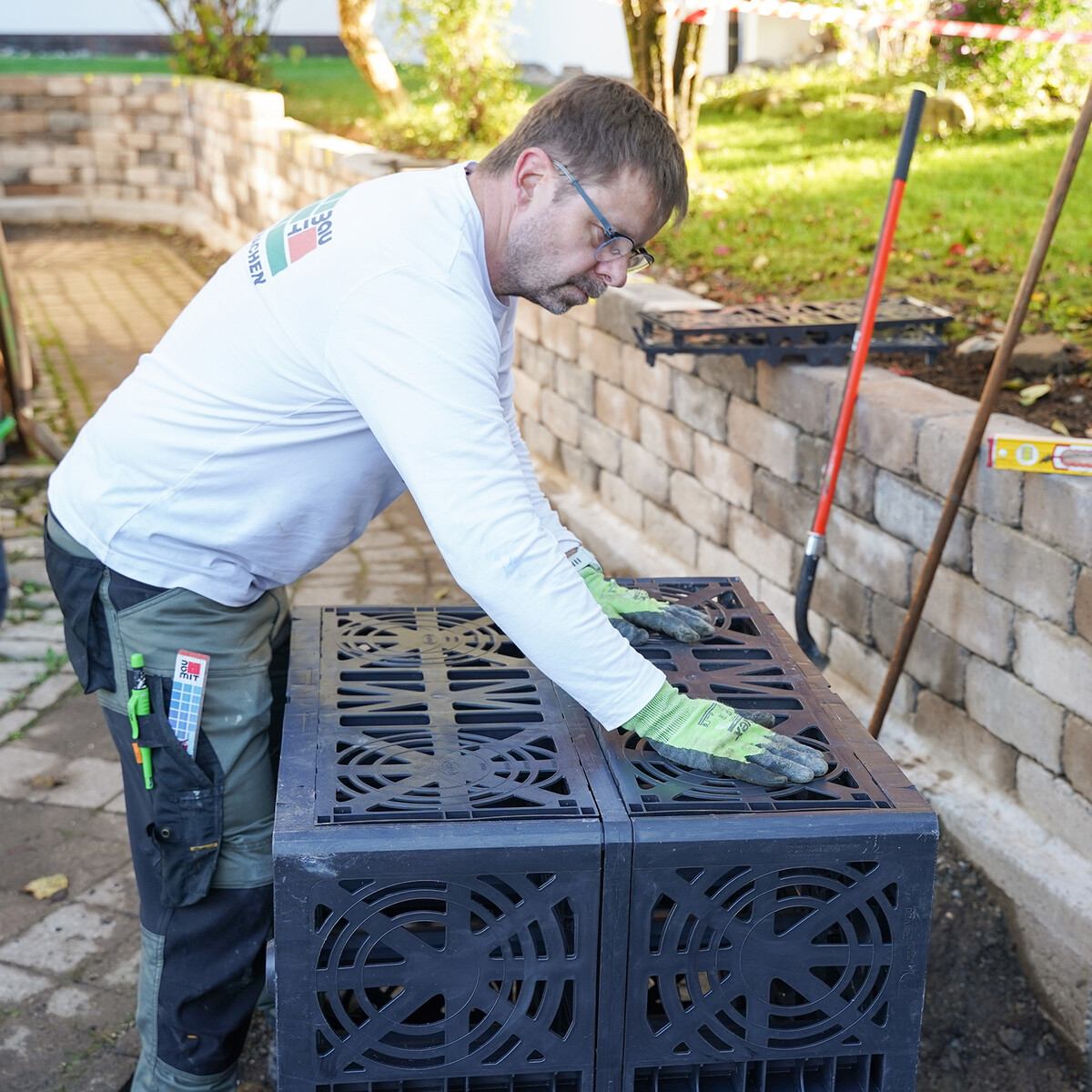 Die Sickerbox EcoBloc von der Marke GRAF wird bewusst in Einzelteilen geliefert, da nur auf diesem Weg ein extrem platzsparender Versand ermöglicht wird.
