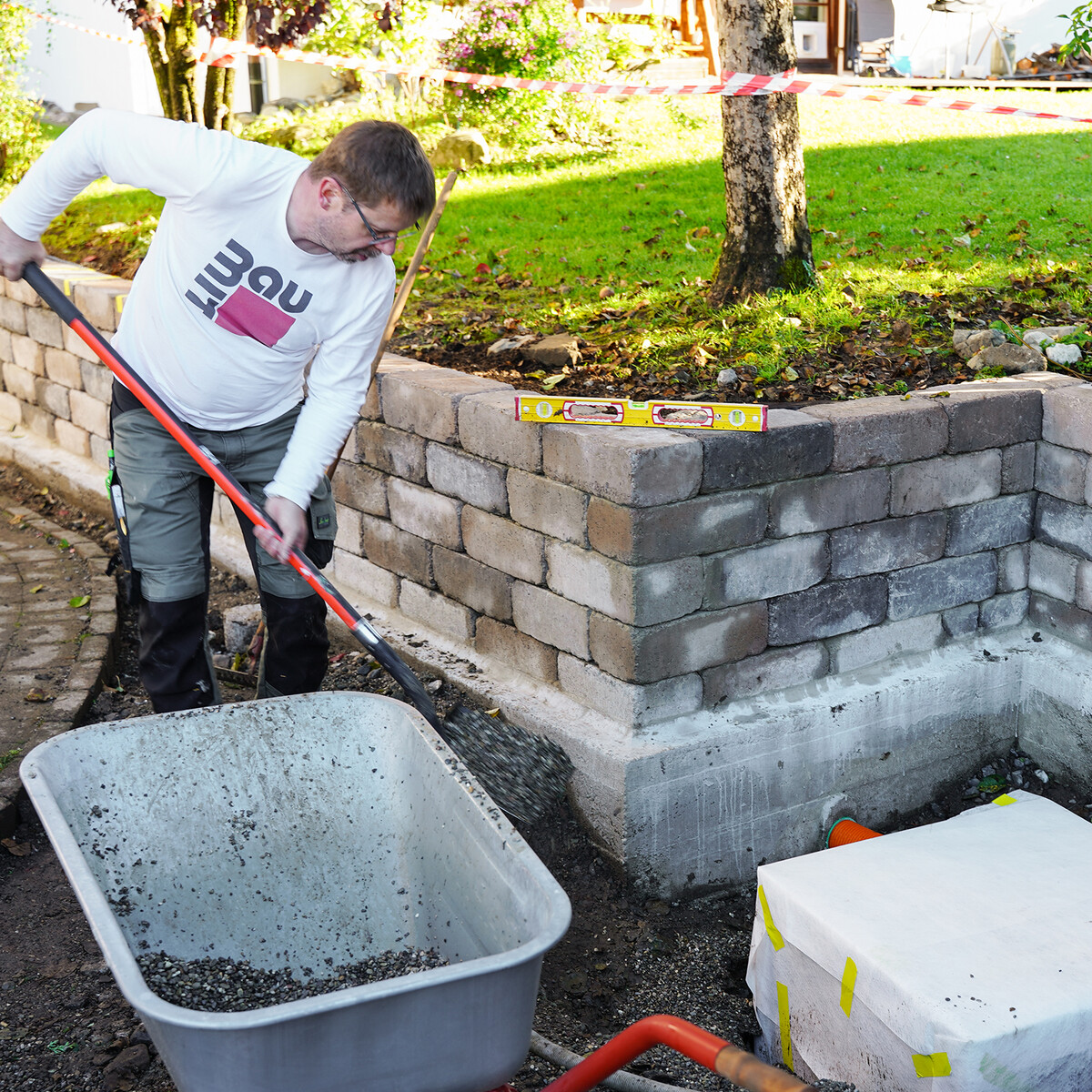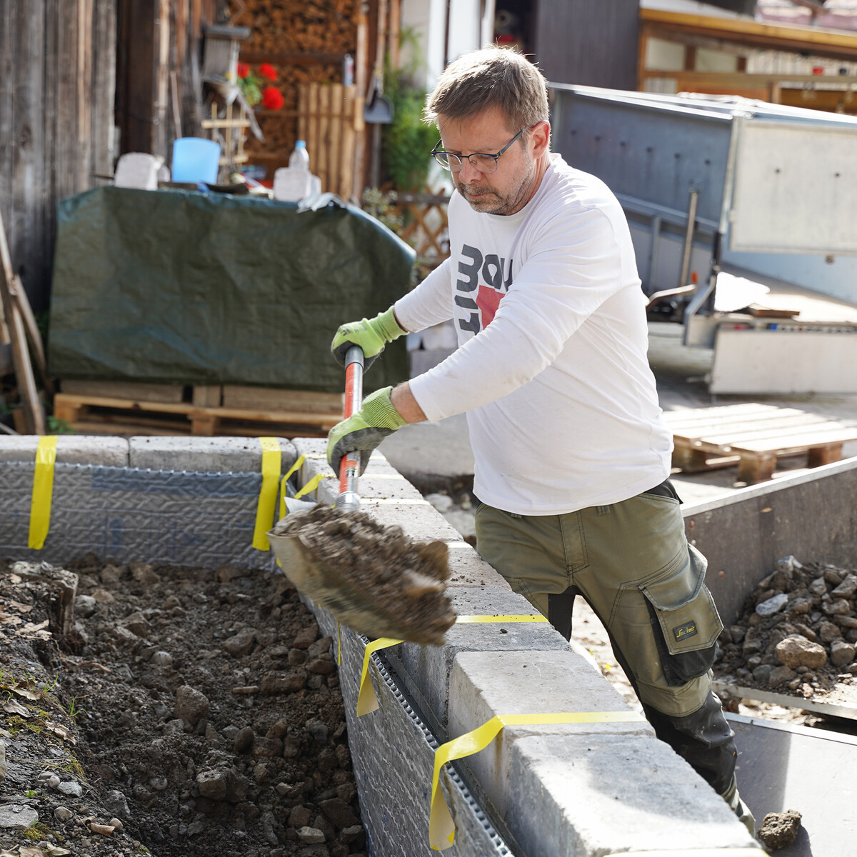 Zuletzt füllst du die Baugrube mit dem Aushubmaterial wieder auf, sofern dieses geeignet ist. Wir empfehlen, dabei in mehreren Schichten vorzugehen. Bei den Landschaftsbauarbeiten wird jede Schicht manuell (maximale Dicke ca. 10 cm) oder maschinell (zwischen 20 und 30 cm) verdichtet, bevor die nächste Schicht aufgebracht wird.