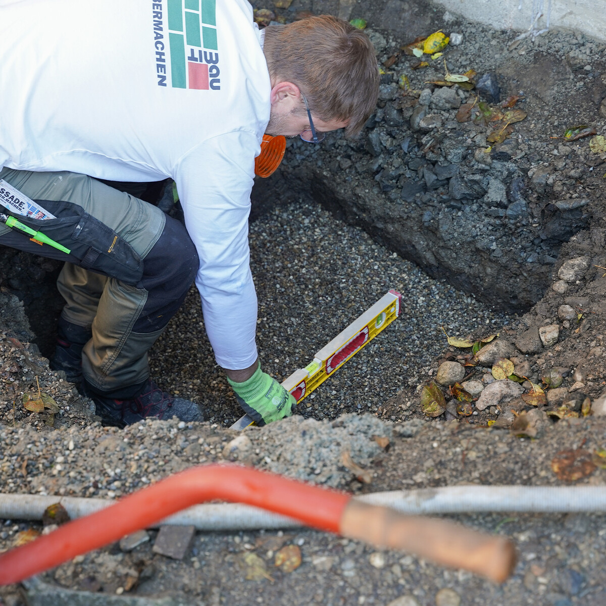 Die Baugrube muss so tief ausgehoben werden, dass die Drainagerohre über die komplette Länge mindestens 10 cm dick mit Kies unterfüttert werden können.