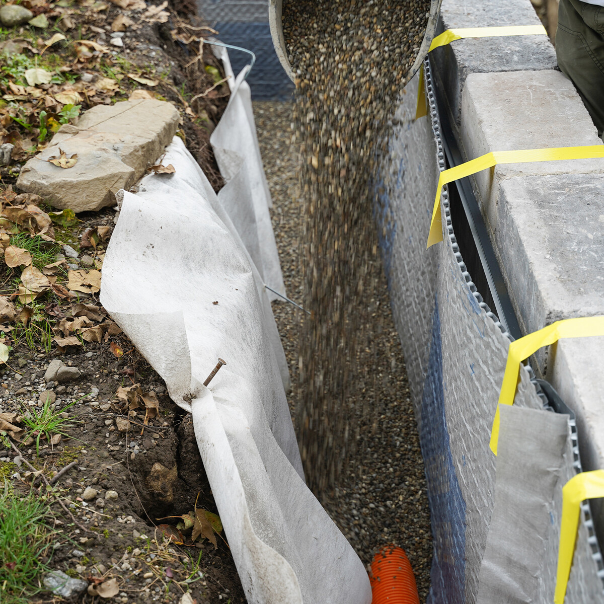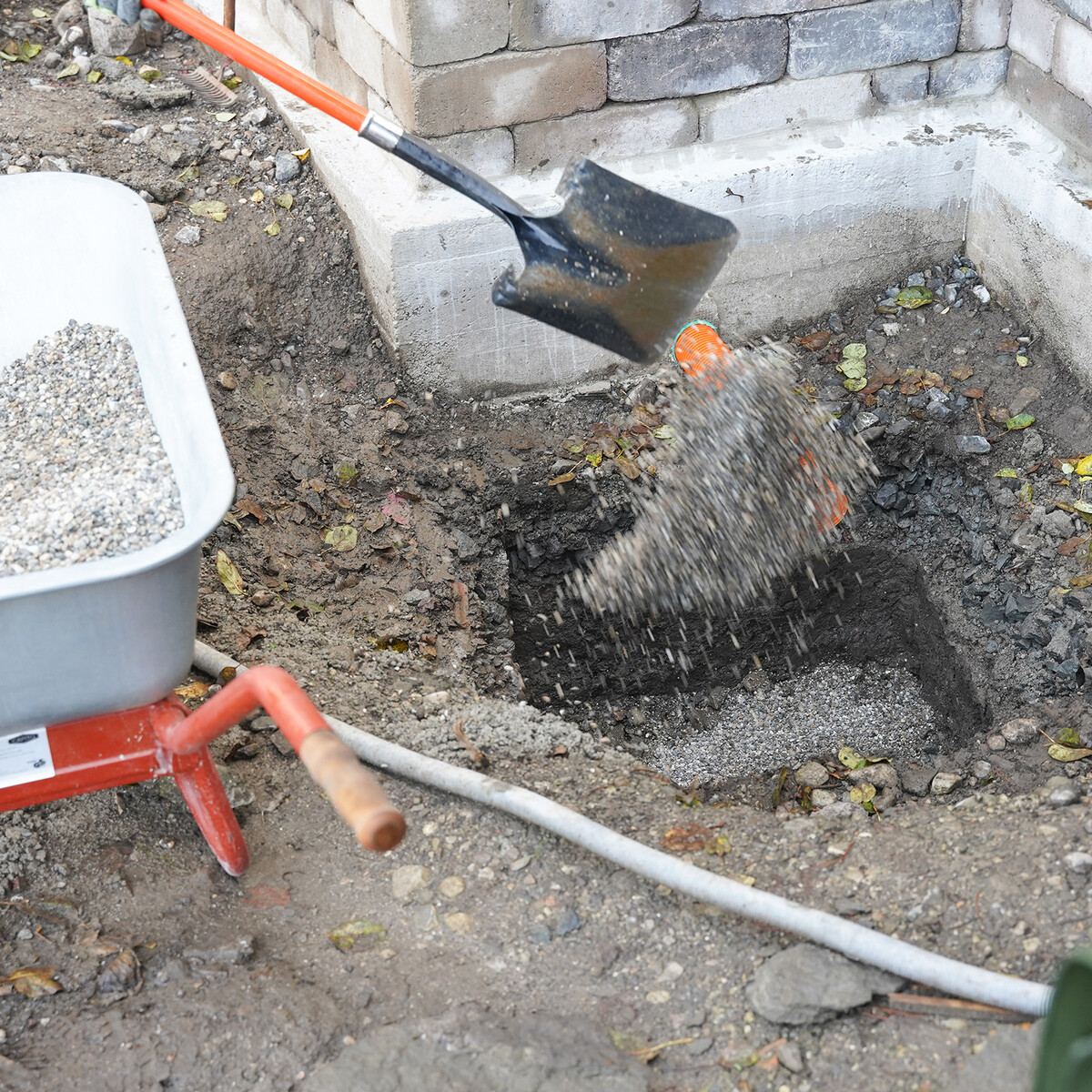 Als Unterbau für das Drainagerohr wird Kies aufgefüllt. Verwende gewaschenen Kies 8/16 mm oder speziellen Filterkies.