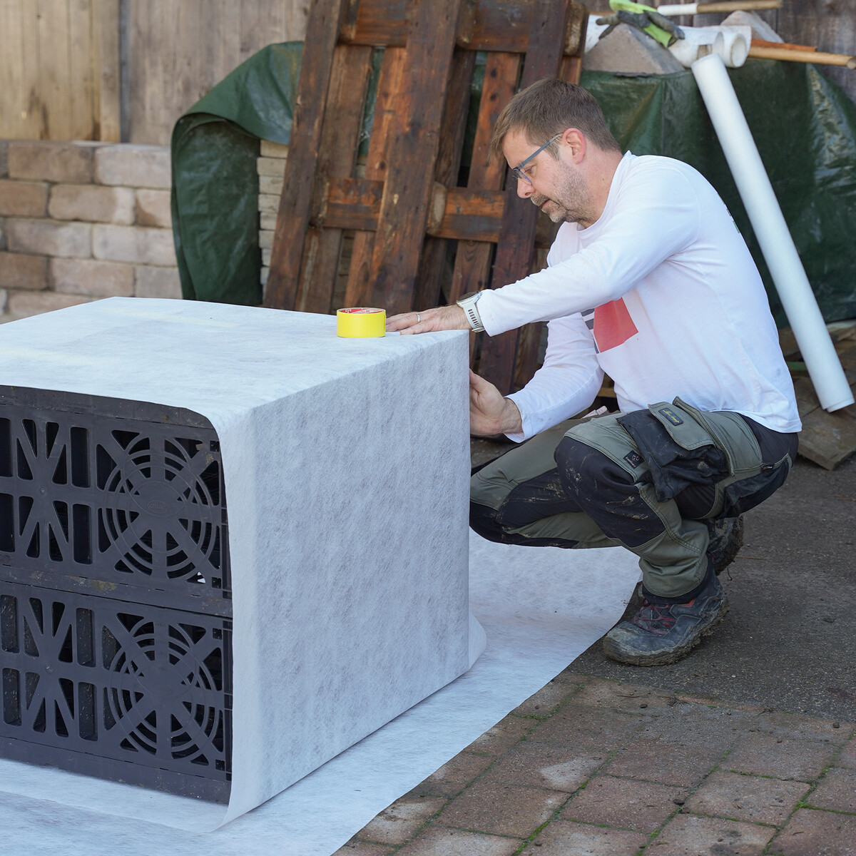 Die Sickerbox muss vollständig in Drainagevlies eingeschlagen werden. Üblicherweise wird das Vlies dabei in der Grube ausgelegt und dann die Boxen aufgestellt (plane in diesem Fall eine grössere Breite der Grube ein).