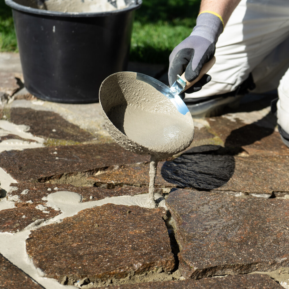 Natursteine und Terrassenplatten mit Pflasterfugenmörtel wasserundurchlässig verfugen