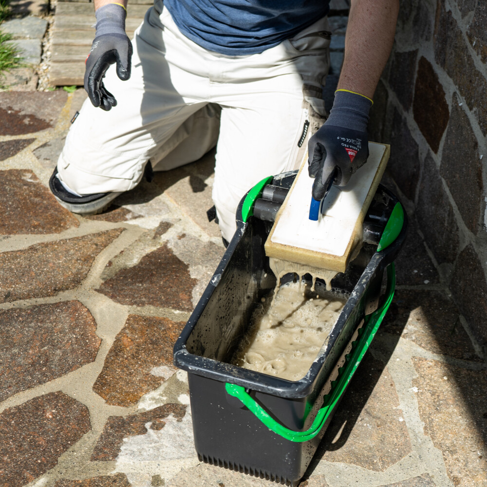 Feuchte die zu verfugende Fläche gründlich an. So verhinderst du ein zu schnelles Anziehen des Fugenmörtels. Gleichzeitig kann sich der Naturstein mit Wasser vollsaugen, damit der Mörtel nicht in den Stein eindringen kann.