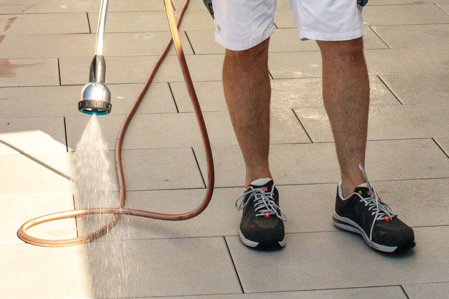 Auch Natursteine können leicht saugend wirken. Um zu verhindern, dass Bindemittel vom Stein oder Pflaster aufgesaugt wird, muss die Fläche vorher gründlich vorgenässt werden. Habe dabei keine Scheu. Achte jedoch darauf, dass kein Wasser in der Fuge stehen bleibt.