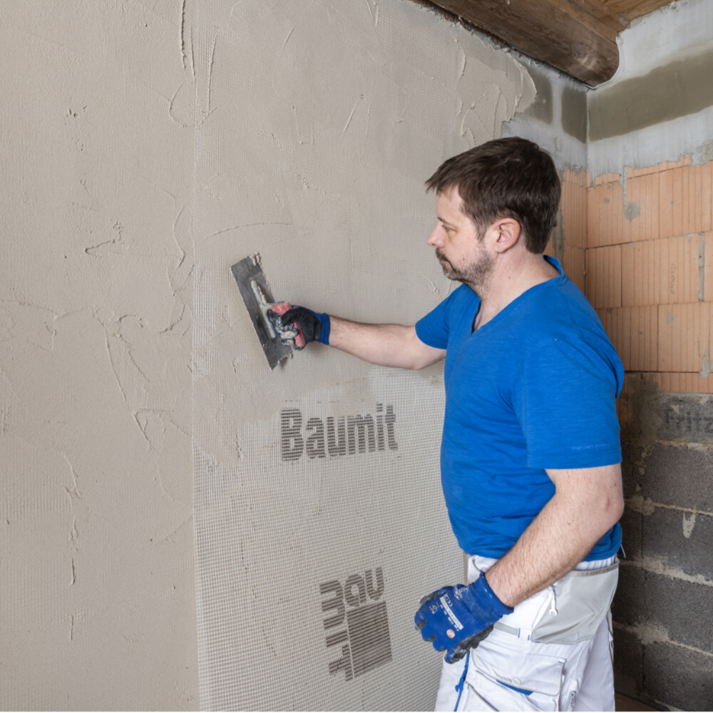 Der Untergrund muss fest, tragfähig und frei von Schmutz und Staub sein. Die zu verputzende Fläche muss gleichmässig ausgetrocknet sein. Betonflächen und andere glatte, nicht saugfähige Untergründe mit einem geeigneten Haftvermittler, z. B. Baumit Fassaden- und Sanierngsspachtel weiss, vorbehandeln. Besonders glatte Flächen vorher gut aufrauen. Filmbildende Trennmittel sind unbedingt zu entfernen.