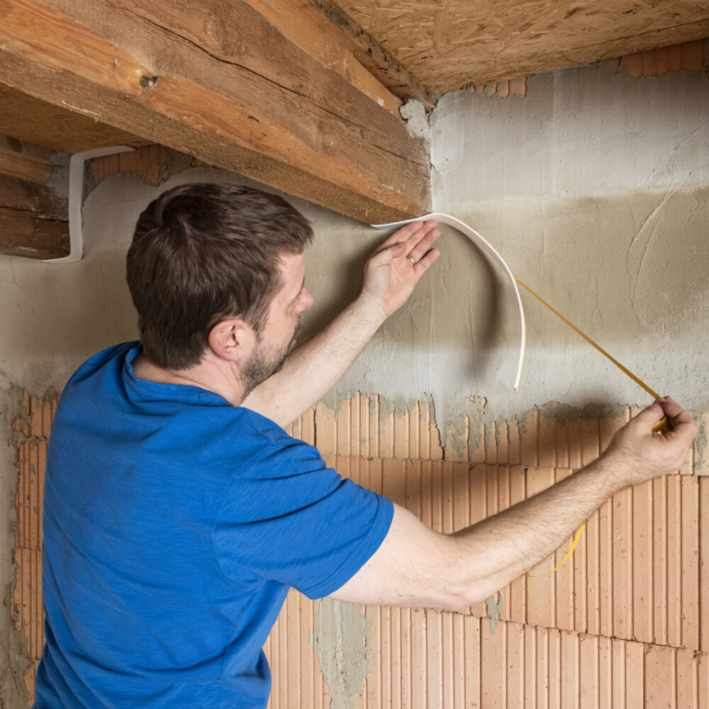 Bevor du mit dem Verputzen beginnst, ist der Übergang von Holz (Balken, Bretter, etc.) und späterem Putz mit einem selbstklebenden Putzanschlussband (z.B. SR-Band) abzukleben, um hier Abplatzungen zu vermeiden. Das überstehende Band wird dann nach der Aushärtung des Kalkputzes bündig mit einem scharfen Messer abgeschnitten.