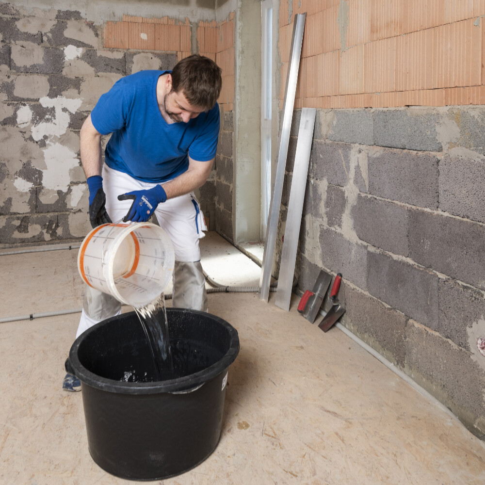 Zum Anmischen gibst du sauberes Wasser und den Kalkputz in einen sauberen Mörtelkübel. Die benötigte Wassermenge findest du im Produktdatenblatt oder auf der Verpackung. Keine anderen Materialien beigeben.