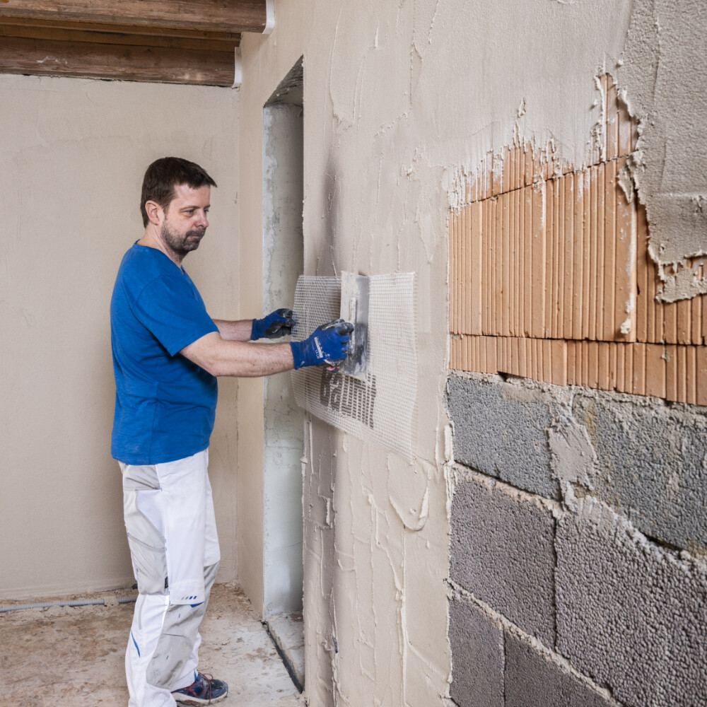 Schneide dir eine Bahn Baumit Armierungsgewebe auf Länge zu und bette die Bahn mit einer Zahnkelle in den frischen Kalkputz ein. Das Armierungsgewebe soll nach dem Einbetten vollständig im oberen Drittel der Putzlage liegen und nicht mehr zu sehen sein.