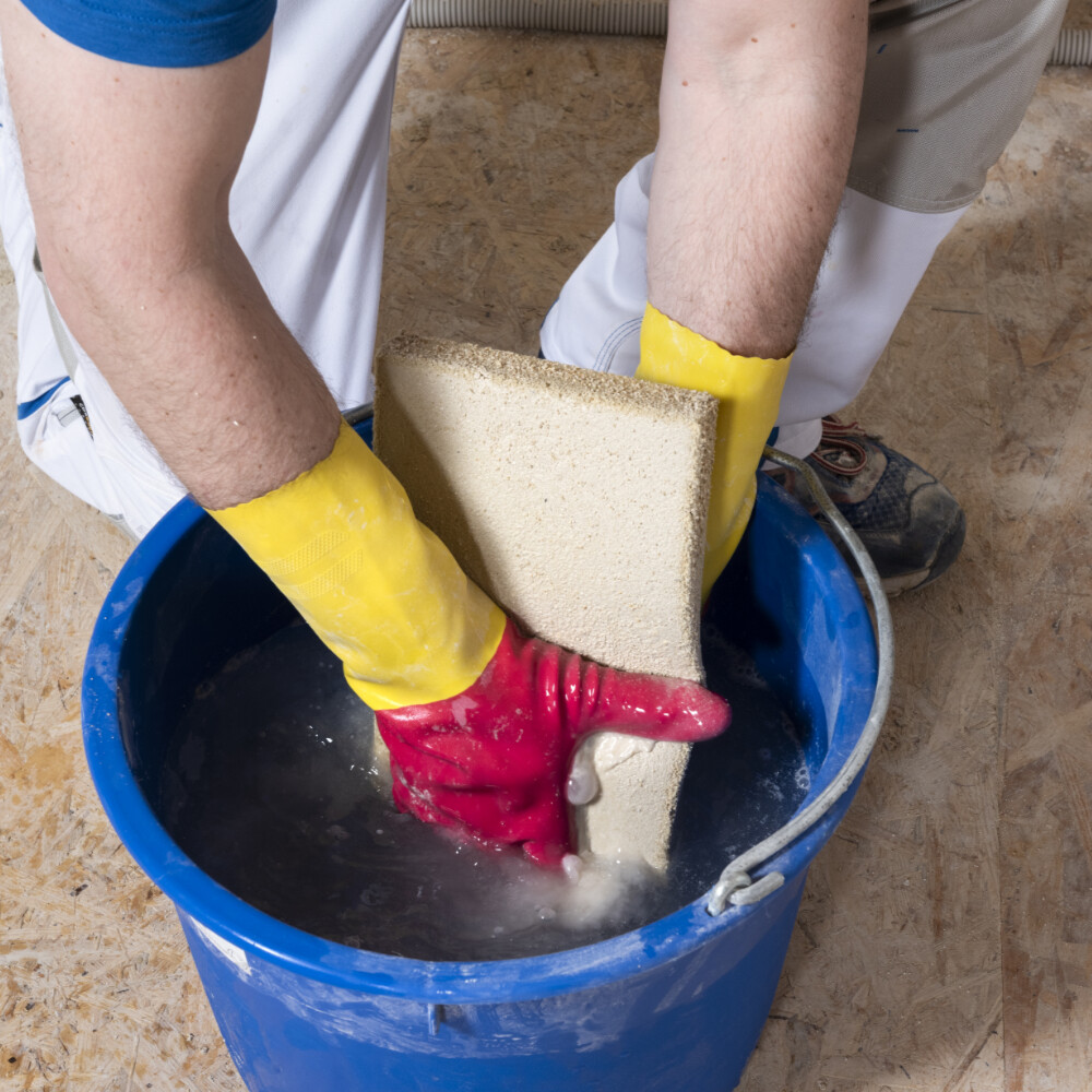 Nachdem sich der Kalkputz oberflächig verfestigt hat, kannst du die Fläche mit einem Schwamm- oder Filzbrett filzen und damit fertig stellen. Prüfe die Oberfläche mit Daumendruck. Sollte der Putz nicht mehr nachgeben, kann mit den Filzarbeiten begonnen werden. Bei einer Auftragsdicke von 3 mm kann dies bei der zweiten Lage bereits nach 15 bis 30 Minuten der Fall sein.