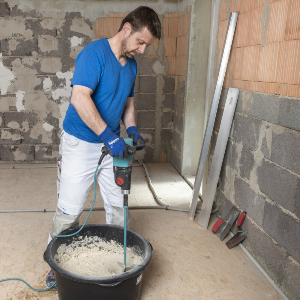 Besonders bei grossen Mengen ist zum Anmischen des Putzes ein elektrisches Rührwerke empfehlenswert. Mische das Material solange durch bis eine homogene, knötchenfreie Putzmasse entsteht.