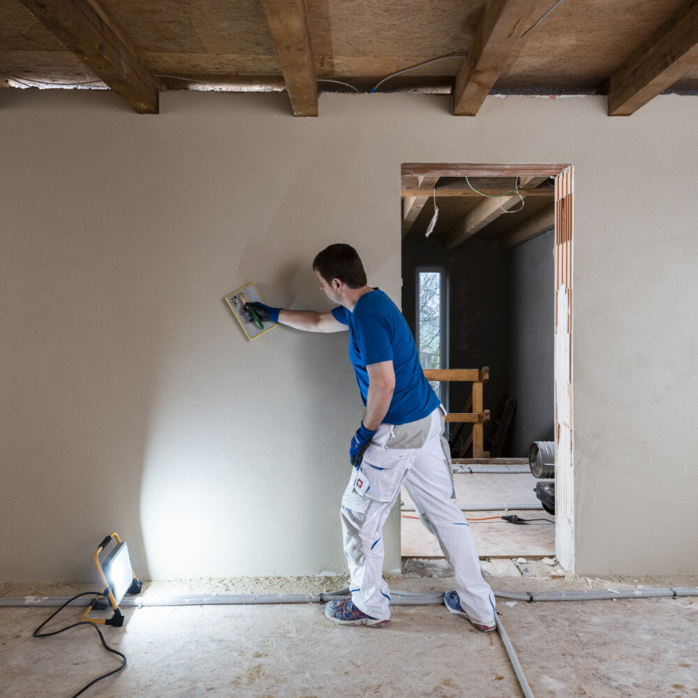 Für möglichst ebene Filzputzflächen ist ein Streiflicht eine grosse Hilfe. Stelle dir während den Filzarbeiten einen Baustrahler seitlich an die Wand. So kannst du über die Schattenbildung an der Wand sehr gut noch zu bearbeitende Fläche erkennen.