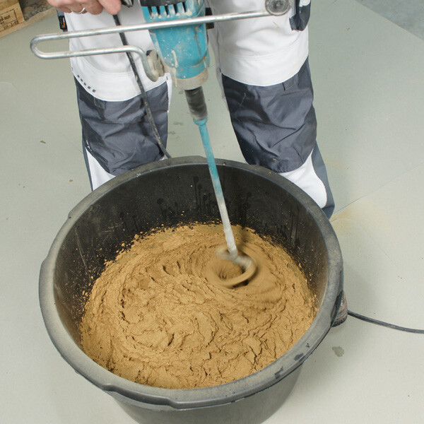 Besonders bei grossen Mengen empfiehlt sich der Einsatz eines elektrischen Rührwerkes für das Anmischen den Putzmaterials. Mische das Material solange durch, bis eine homogene, knötchenfreie, gleichmässige Konsistenz entsteht.