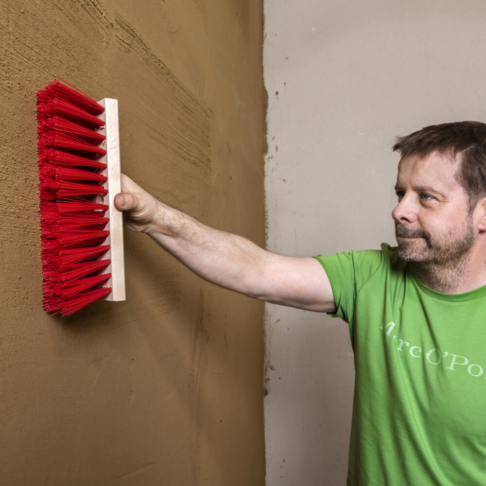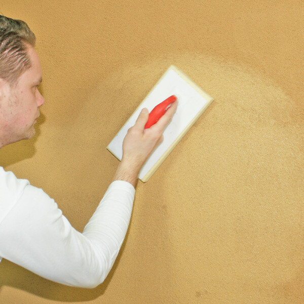 Nachdem der Lehmputz oberflächlich angezogen hat, kann man die Oberfläche mit einem Filzbrett orange oder Filzbrett weiss filzen und damit fertigstellen. Prüfe die Oberfläche mit Daumendruck. Sollte der Putz nicht mehr nachgeben, kann mit dem Strukturieren begonnen werden. Dafür die Oberfläche leicht anfeuchten und mit einem Filzbrett in kreisenden Bewegungen abfilzen. Dabei soll eine gleichmässige, kantenlose Oberfläche entstehen. Sollte der Putz dabei schmieren, ist er noch zu feucht und benötigt mehr Trocknungszeit. Beim Filzen werden Sandkörner an die Oberfläche geholt, die nach dem Abtrocknen von der Putzfläche abzukehren sind.