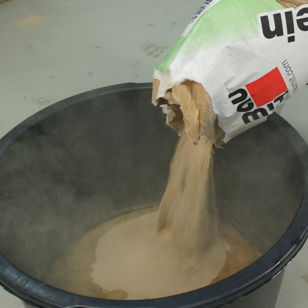 Zum Anmischen leerst du klares Wasser und den Lehmputz in einen sauberen Mörtelkübel. Die benötigte Wassermenge entnimmst du dem Produktdatenblatt bzw. den Angaben auf dem Sackgebinde. Keine anderen Materialien beigeben.