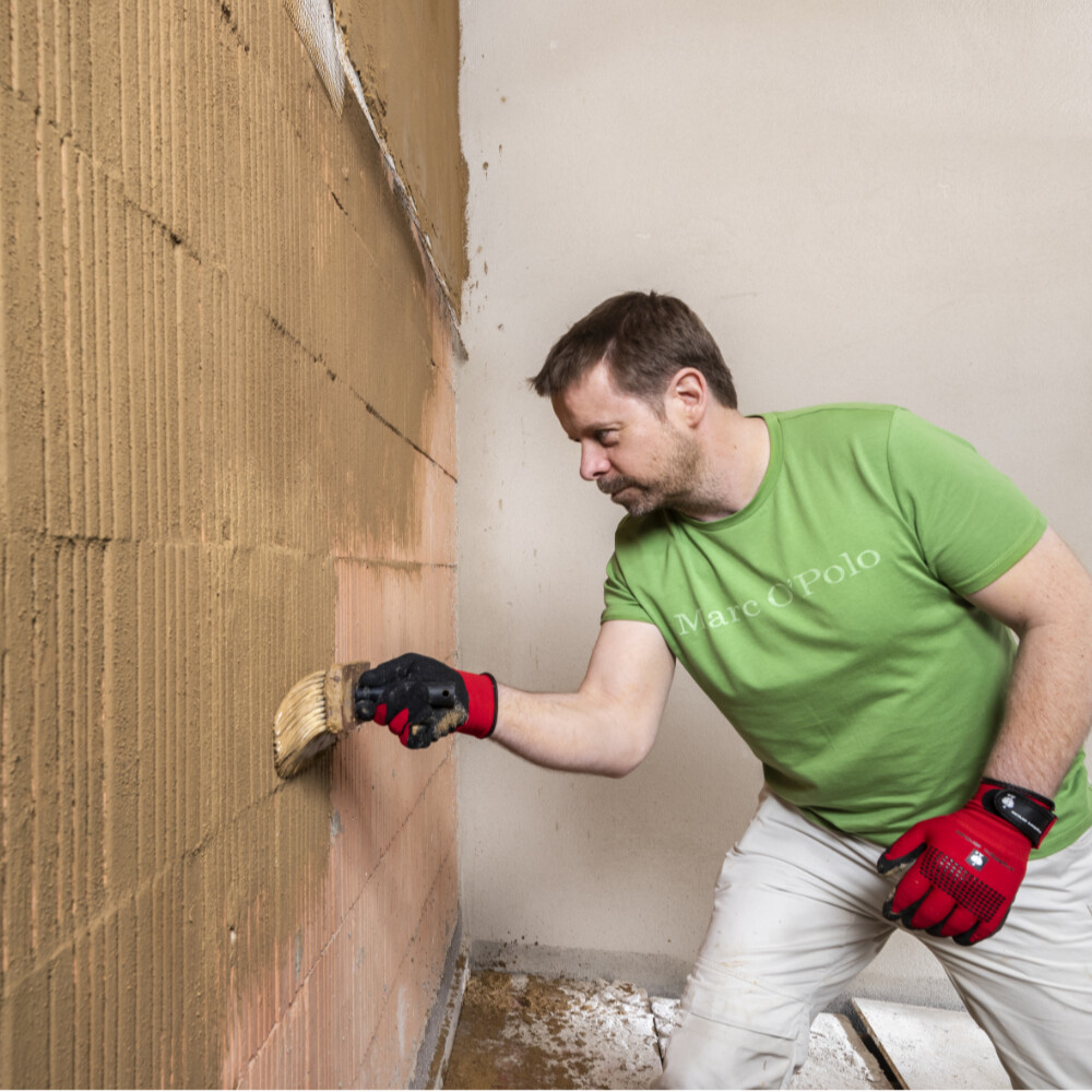 Mische die Lehmhaftschlämme, wie in den Angaben auf dem Gebinde bzw. dem Produktdatenblatt zu lesen, in einer joghurtartigen Konsistenz an. Mit einem Quast trägst du die angemischte Lehmhaftschlämme auf den vorbereiteten Untergrund auf. Die Auftragsdicke der Grundierschicht beträgt in der Regel 1 - 2 mm, ist aber stark von der Saugfähigkeit und Beschaffenheit des Untergrundes abhängig. Je nach Saugfähigkeit des Untergrundes musst du ein- oder mehrmals vorstreichen.