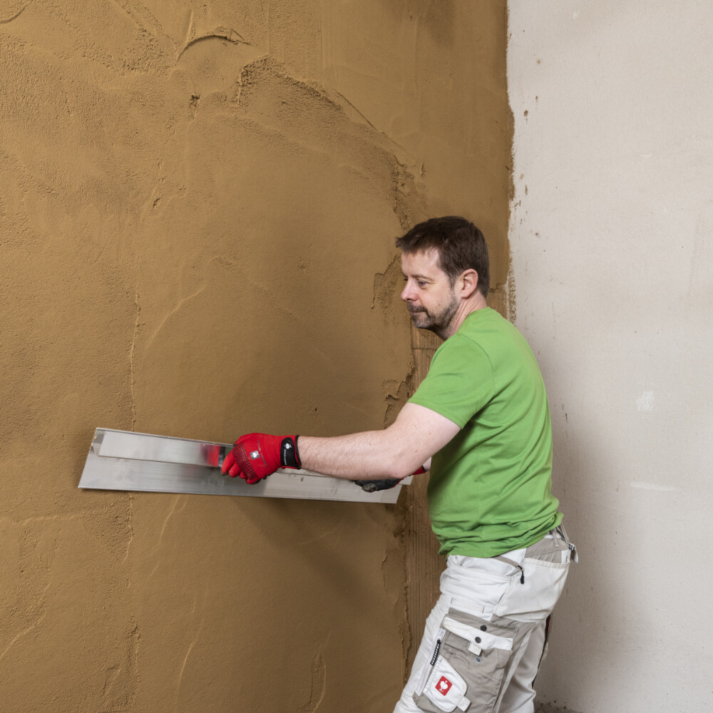 Trage den frischen Lehmputz mit einer rostfreien Glättkelle auf den vorbereiteten Untergrund auf. Die zuvor aufgetragene Lehmhaftschlämme muss hierbei noch matt feucht sein. Sollte die Lehmhaftschlämme bereits angetrocknet sein, ist diese nochmals anzufeuchten.