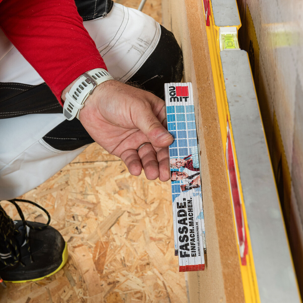 An Fenstern und Türen musst du die Holzfaserdämmplatten anpassen. Am einfachsten geht das so: Platte anhalten und den nötigen Ausschnitt mit einem Stift direkt anzeichnen. Danach sägst du die Platte zu.