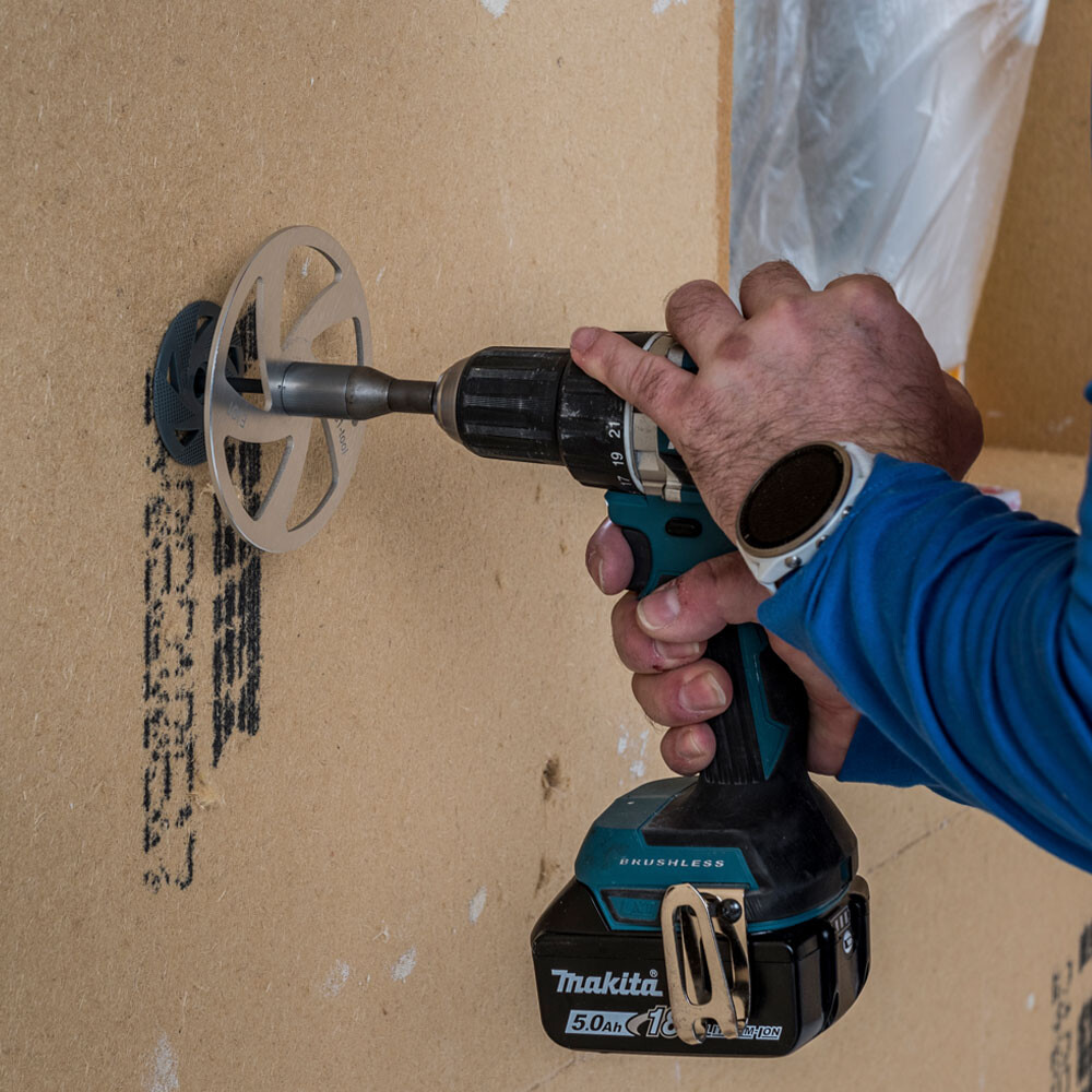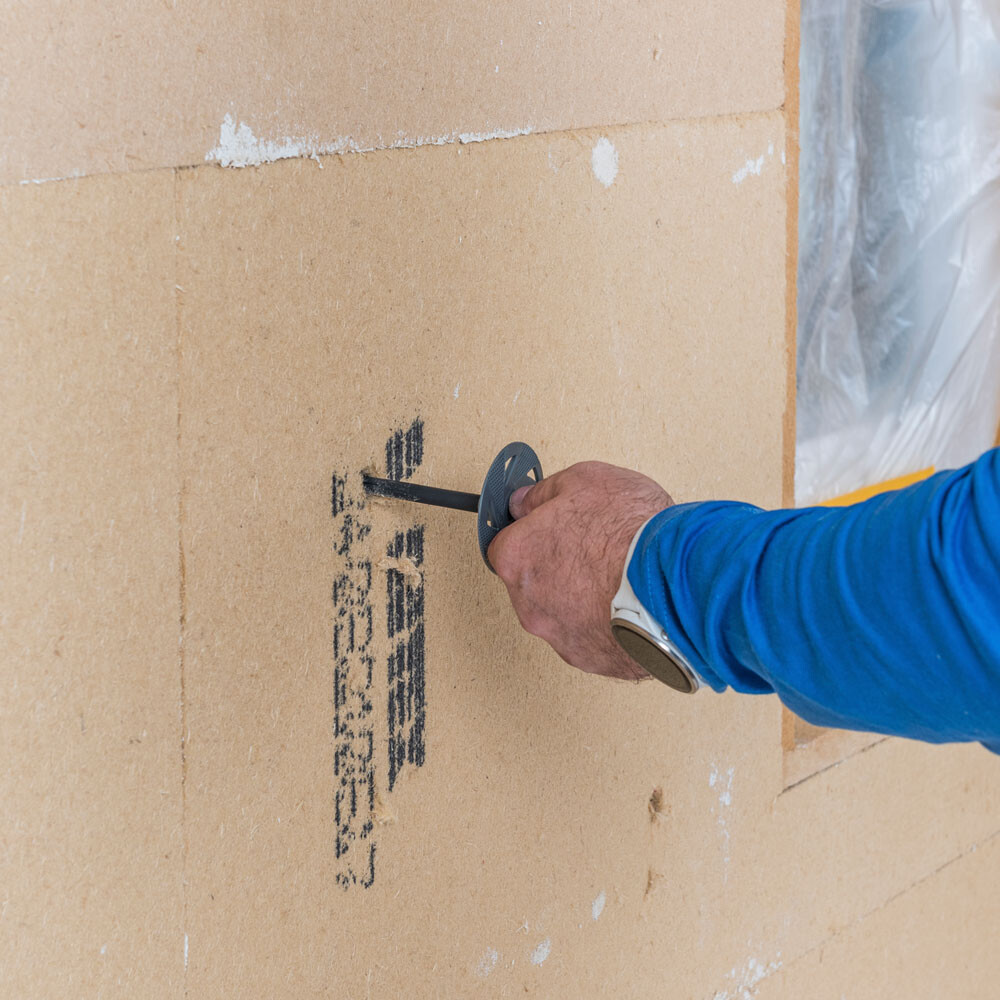 Danach schiebst du den Schraubdübel in das vorbereitete Bohrloch bis der Dübelteller auf der Dämmplatte aufliegt.