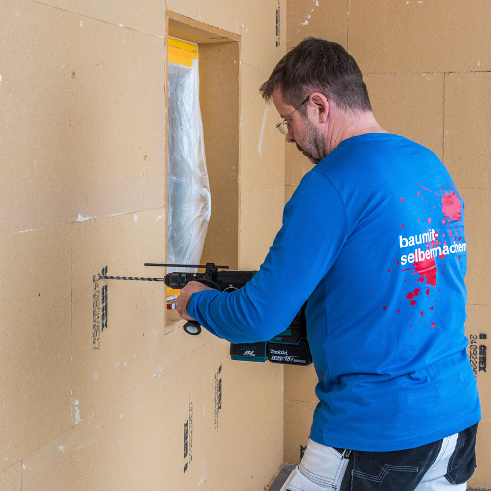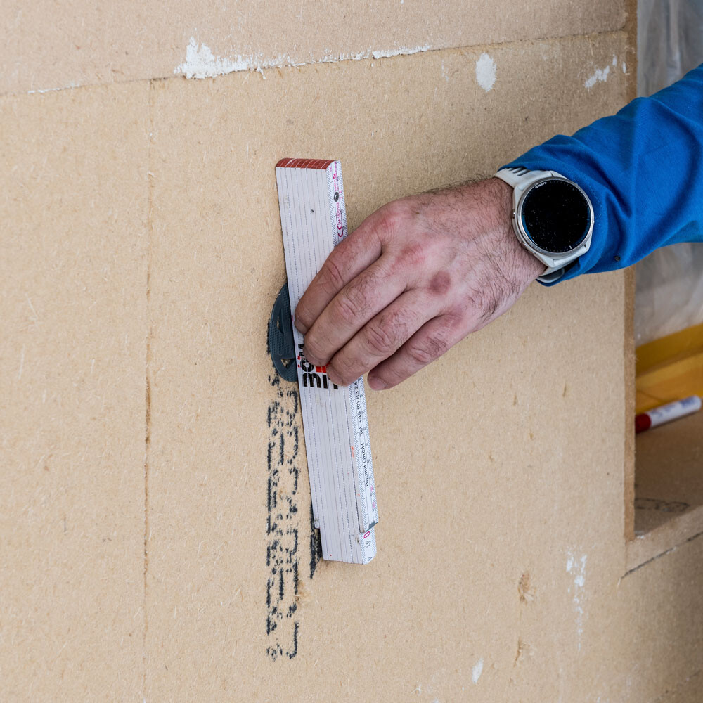Die in der Anleitung gezeigte Positionierung der Dübel ist gültig für die Innendämmplatte Thermoroom aus Holzfaser mit einem Format von 120 x 50 cm. Bei anderen Platten bzw. Plattenformaten kann das Dübelschema abweichen. Für Rückfragen kannst du dich gerne an Baumit wenden. Schreibe eine Nachricht an info@baumit-selbermachen.de