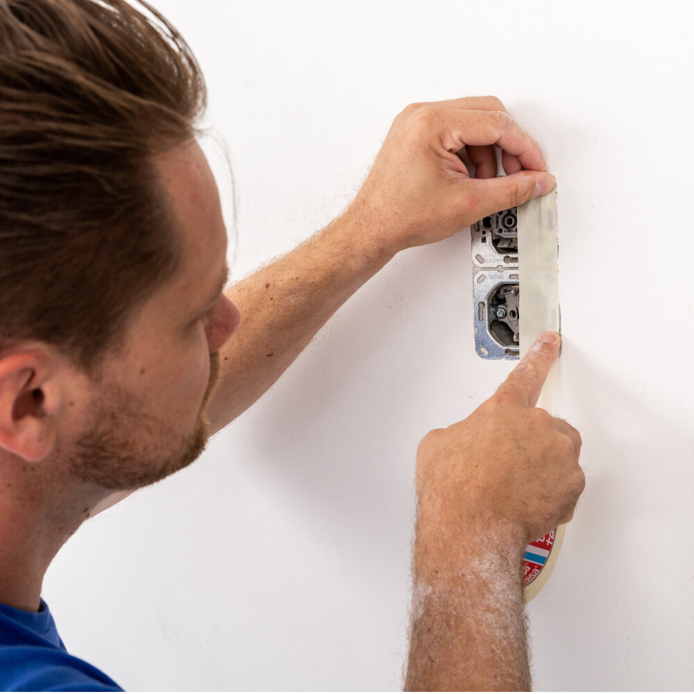 Nachdem du den Strom am Sicherungskasten abgeschaltet und die Schalterrahmen demontiert hast, werden die Elektrodosen und Schalter mit Malerkrepp vor Verschmutzung geschützt.