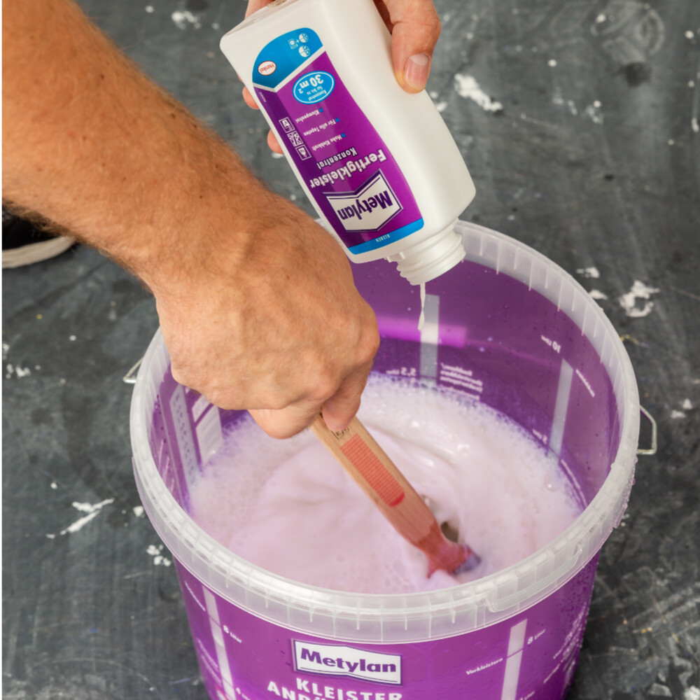 Rühre den Kleister entsprechend den Angaben des Herstellers an. Achte auf einen Kleister, der für Maler- und Renoviervlies geeignet ist.