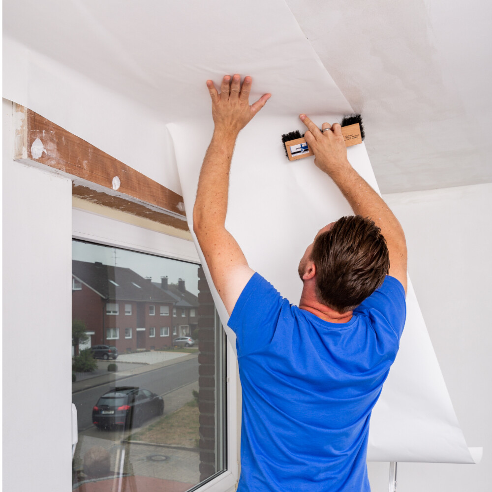 Bei der Anbringung von Maler- bzw. Renoviervlies empfehlen wir dir zuerst die Decke zu kleben.