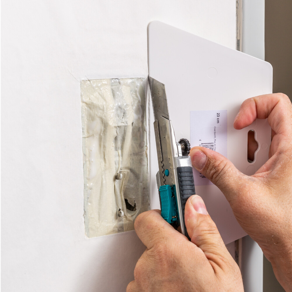 Die zuvor abgeklebten Schalter und Steckdosen mit dem Andrückwerkzeug und einem scharfen Cuttermesser exakt ausschneiden.