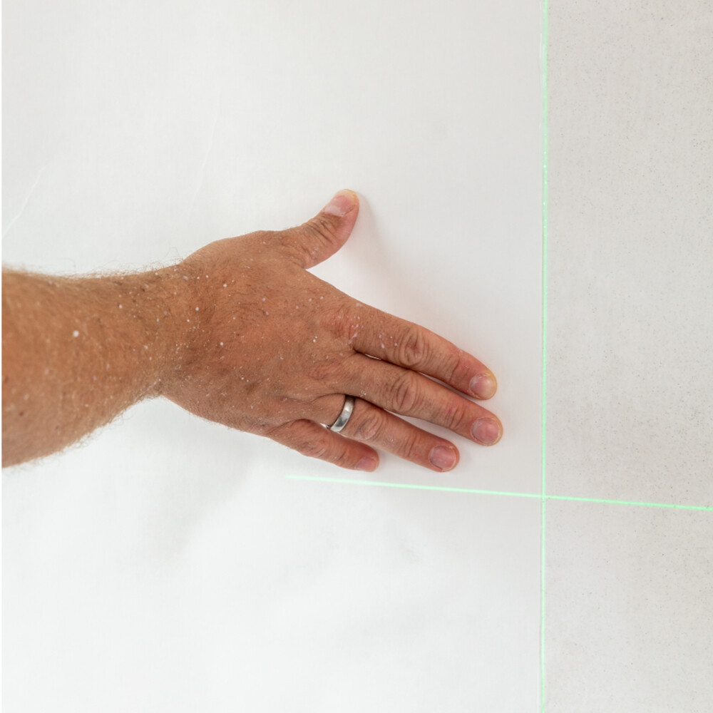 Einfacher und schneller gehen die Arbeiten mit einem kleinen Baulaser. Achte darauf, dass das Renoviervlies in der Ecke ca. 5 cm überstehend geklebt wird.