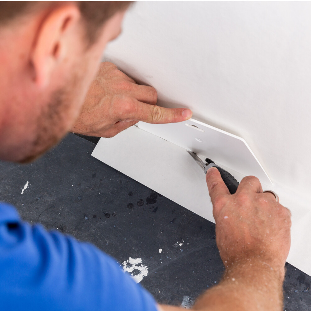 Das Andrückwerkzeug hat zweit unterschliedlich dicke Kanten (ca. 2mm und 5 mm). Wir empfehlen Ihnen bei Klebearbeiten von oben kommend, also an der Decke oder an der unteren Kante der Dachschräge mit der dicken Kante zu schneiden und damit einen kleinen Überhang herzustellen. Ansonsten kannst du die dünne Seite verwenden.
