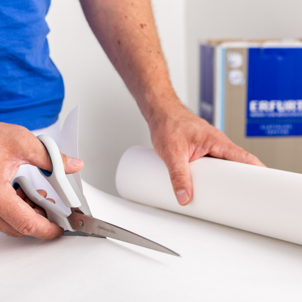 Schneide die Bahnen entsprechend der benötigten Länge auf einem Tapeziertisch zu. Die Bahnen sollten dabei ca. 10 - 15 cm länger zugeschnitten werden, als durch die Wand- bzw. Deckenlänge benötigt wird.