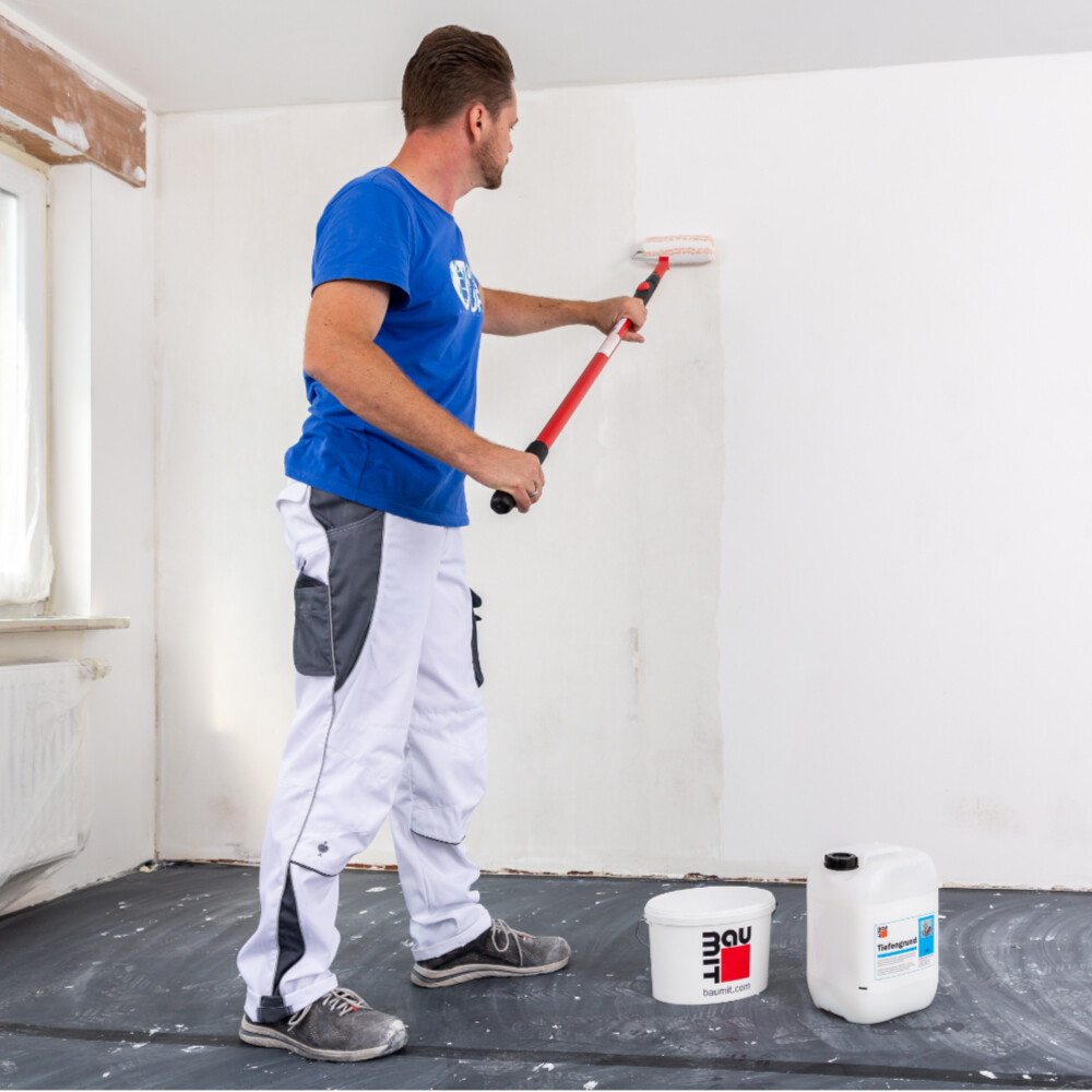 Bei kreidenden oder sandenden Oberflächen grundierst du die Flächen mit einem einmaligen Anstrich mit Baumit Tiefengrund.