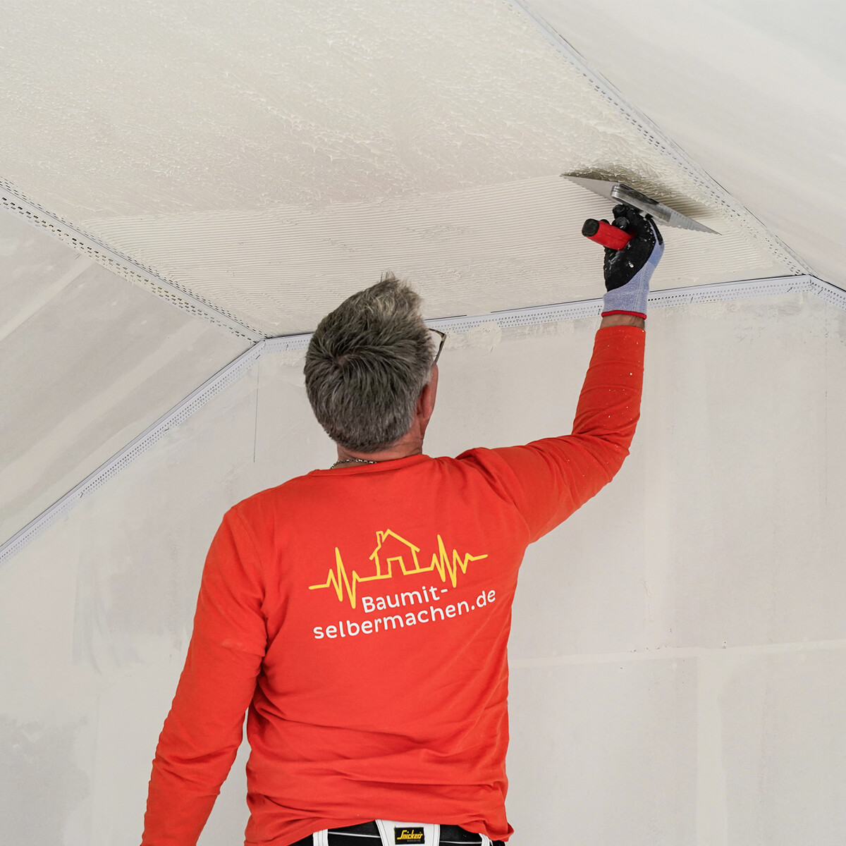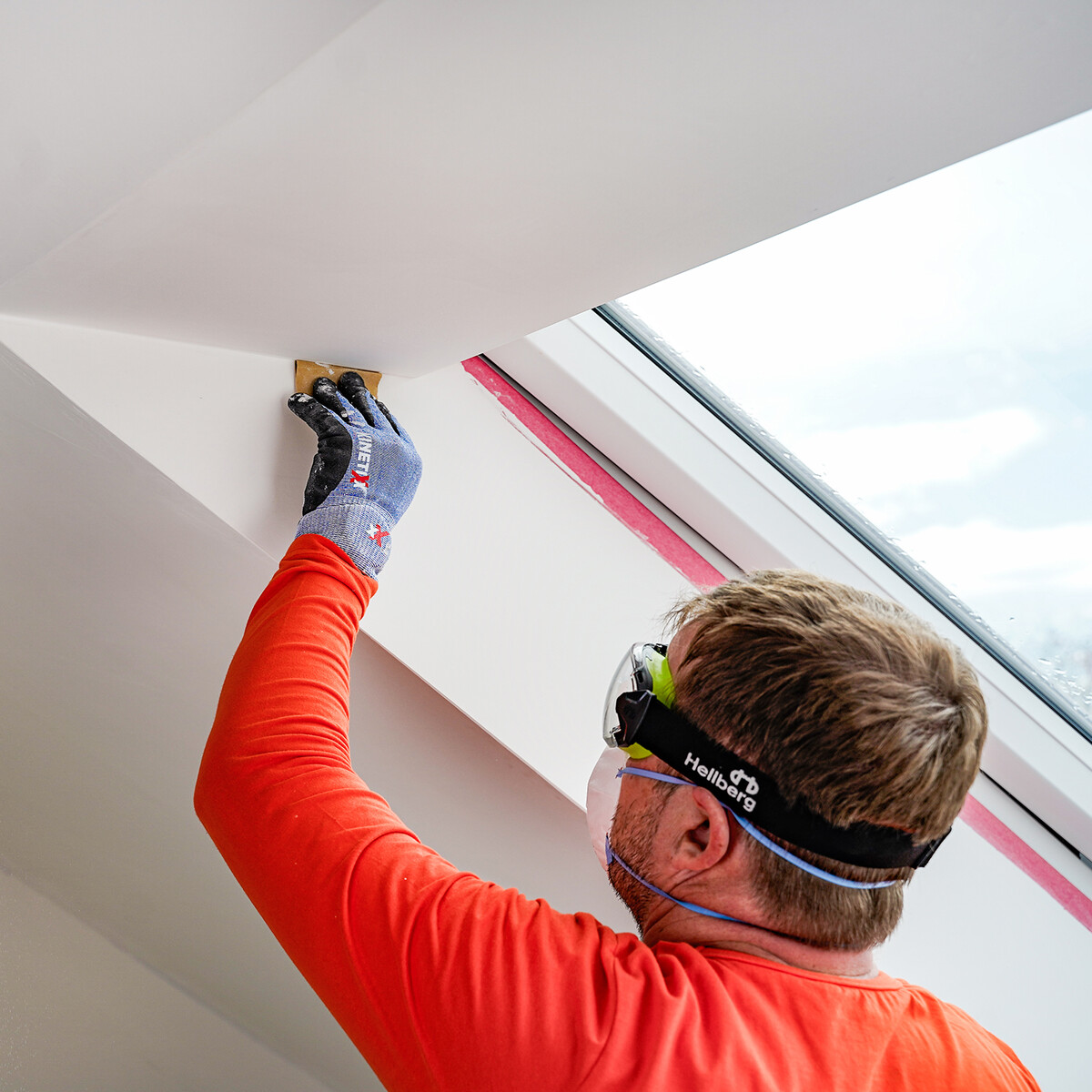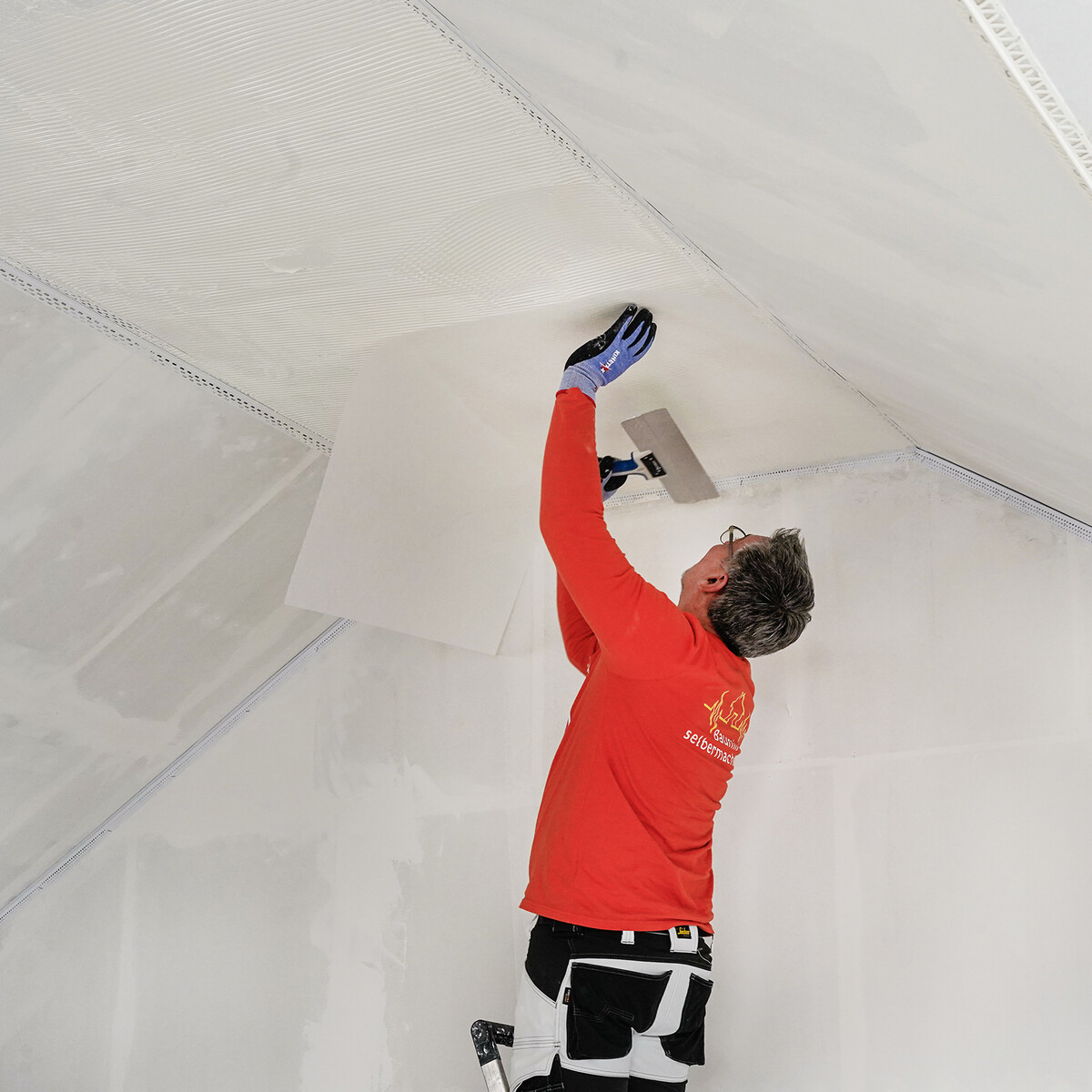 In dieser Anleitung zeigen wir dir, wie du eine Trockenbaudecke, -schräge oder -wand vollflächig mit Rollspachtel beschichtest. Um die Risssicherheit deutlich zu erhöhen, wird dabei ein Spachtelvlies in die frische Spachtelmasse eingebettet. Besonders wenn die Fläche abschliessend gestrichen wird, ist die Einlage eines Spachtelvlies sehr empfehlenswert.