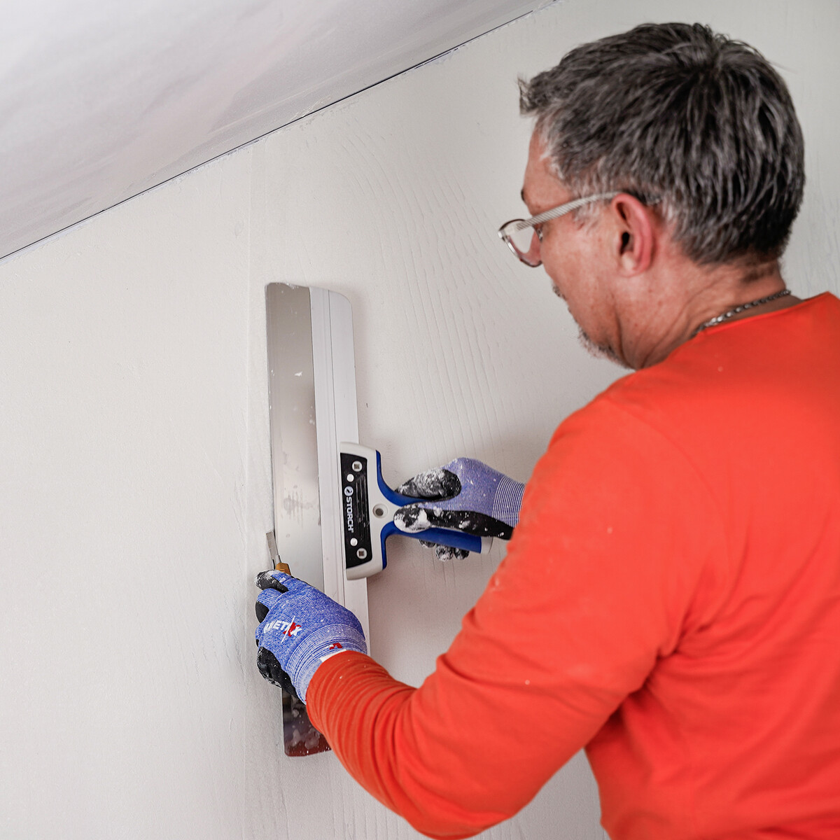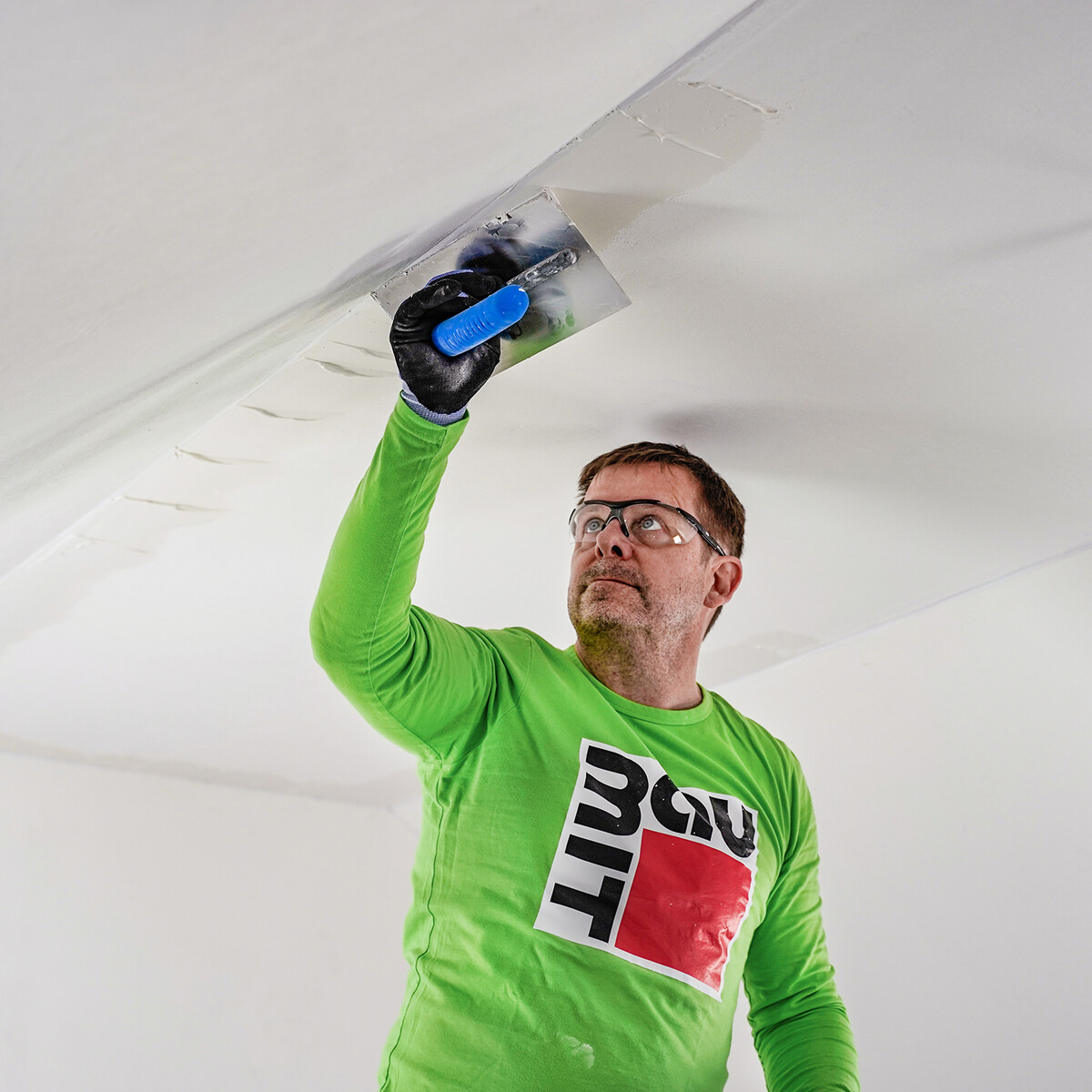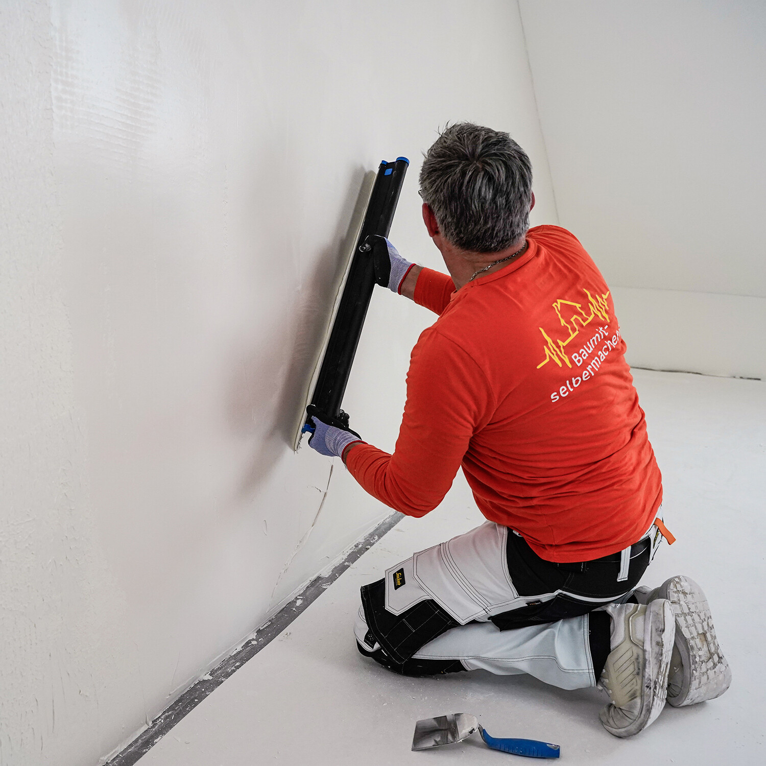 In dieser Anleitung zeigen wir dir, wie du eine Trockenbaudecke, -schräge oder -wand vollflächig mit Rollspachtel beschichtest. Um die Risssicherheit deutlich zu erhöhen, wird dabei ein Spachtelvlies in die frische Spachtelmasse eingebettet. Besonders wenn die Fläche abschliessend gestrichen wird, ist die Einlage eines Spachtelvlies sehr empfehlenswert.
