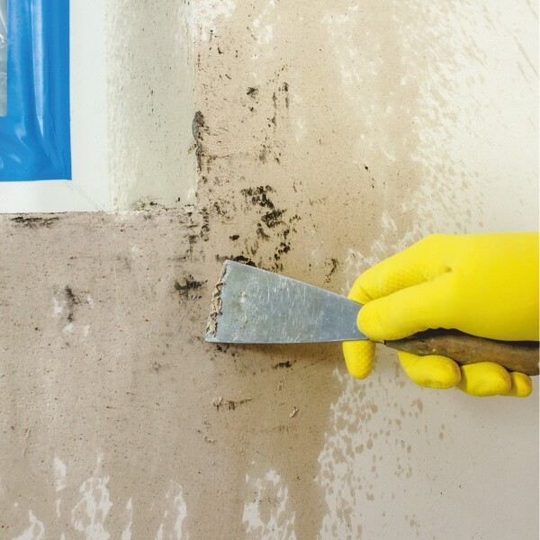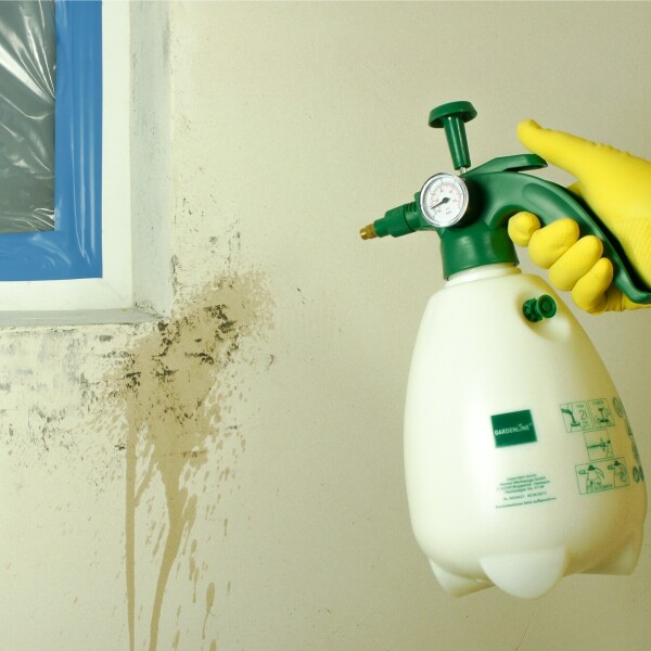 Nach frühestens 2 Stunden entfernst du die Schimmelreste möglichst vollständig. Verwende dafür einen Spachtel oder eine Bürste mit Wasser. Entsorge die Schimmelreste umgehend im Müll. Betroffene Tapeten, Putze o.ä. sind zu entfernen. Achte darauf, die Fläche während der Einwirkzeit feucht zu halten, um den Sporenflug zu minimieren.