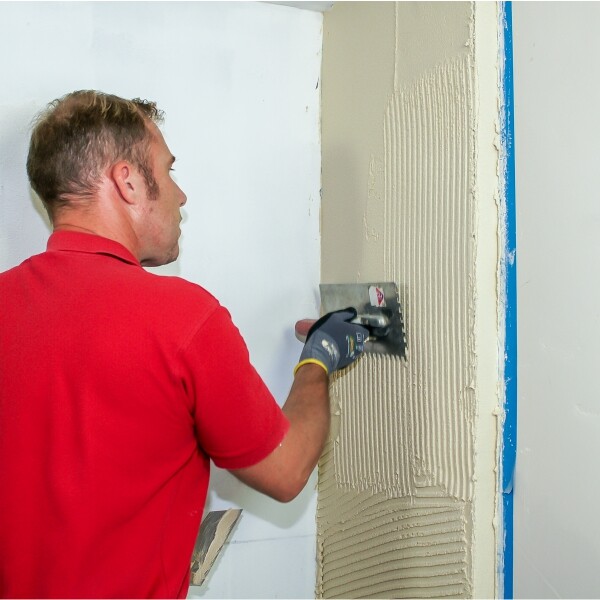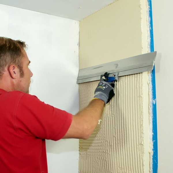 Zur Kontrolle, ob du auch ausreichend Material auf die Wand aufgetragen hast, zahne den frischen Spachtel mit einer Zahnkelle mit 14 mm Halbrundzahnung horizontal oder vertikal auf.