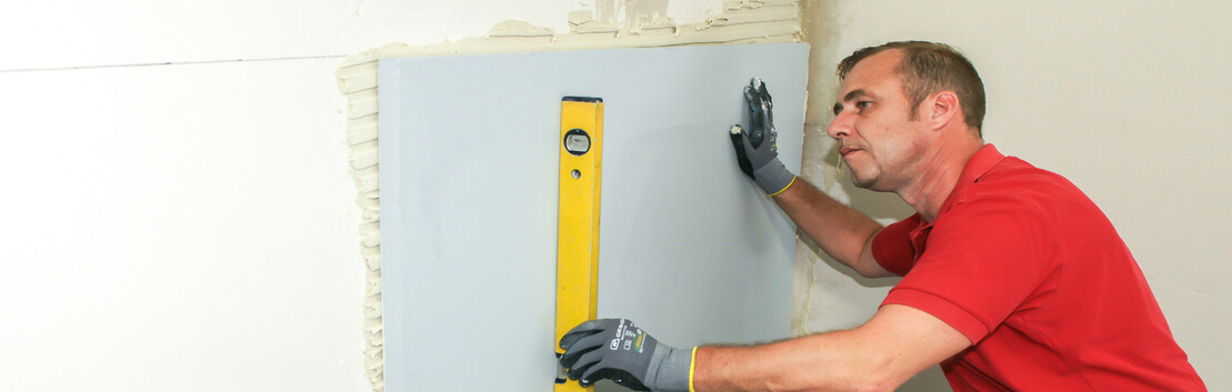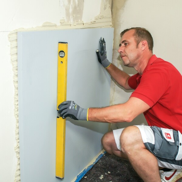 Prüfe mit einer Wasserwaage die korrekte Ausrichtung der Antischimmel Kalziumsilikatplatte in der Horizontalen und Vertikalen.