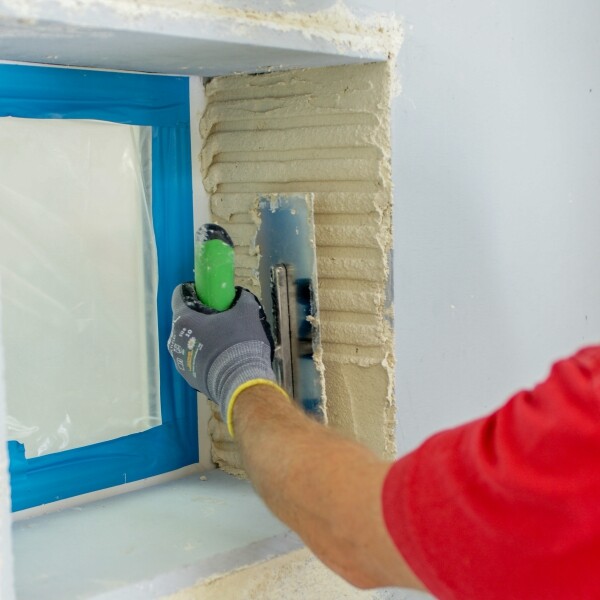 In Laibungen von Fenstern und Türen spachtelst du, wie schon auf der Fläche, den frischen Antischimmel 2 in 1 auf und zahnst ihn mit einer Zahnkelle auf.