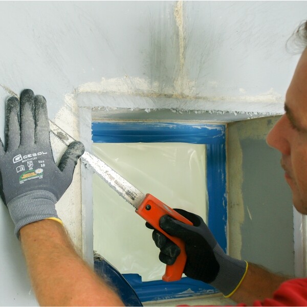 Mögliche grössere, überstehende Kanten kannst du ca. 1 Stunde nach dem Ankleben mit einer Säge oberflächenbündig zur Wandfläche kürzen.