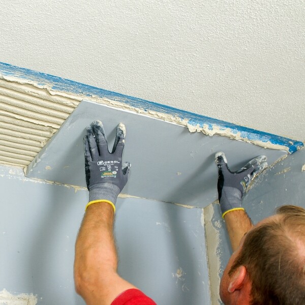 An Decken und angrenzenden Innenwänden wird der Antischimmel Anschlusskeil eingesetzt. Dadurch werden Wärmebrücken in den Anschlussbereichen vermieden. Trage auch hier den frisch angerührten Antischimmel 2 in 1 auf, zahne ihn durch und klebe die Anschlusskeile an. Achte auf die Stossvermörtelung zwischen den einzelnen Anschlusskeilen bzw. zu angrenzenden Wandteilen.