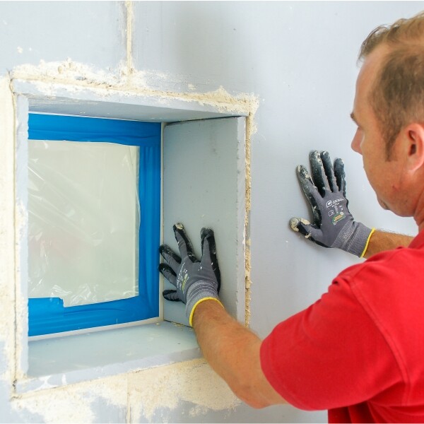 Klebe umgehend nach dem Auftrag des 2 in 1 Spachtels die zugeschnittene und auf der Rückseite mit Minralgrund grundierte Kalziumsilikat-Laibungsplatte an. Sie soll stumpf auf dem Fenster- bzw. Türrahmen aufsitzen. Ein Fugendichtband ist an dieser Stelle nicht erforderlich.