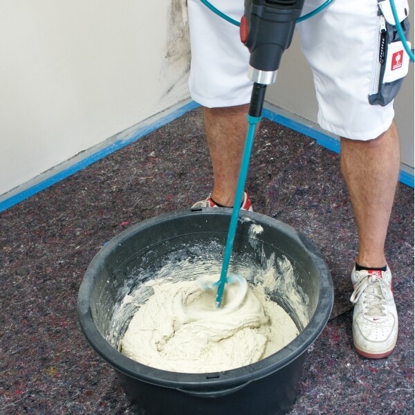 Nun kannst du den Antischimmel 2 in 1 Spachtel in einem sauberen Mörtelkübel anrühren. Für grössere Mengen empfehlen wir dir den Einsatz eines elektrischen Rührwerks. Für einen Sack Antischimmel 2 in 1 benötigst du ca. 6 bis 7 Liter klares Wasser.