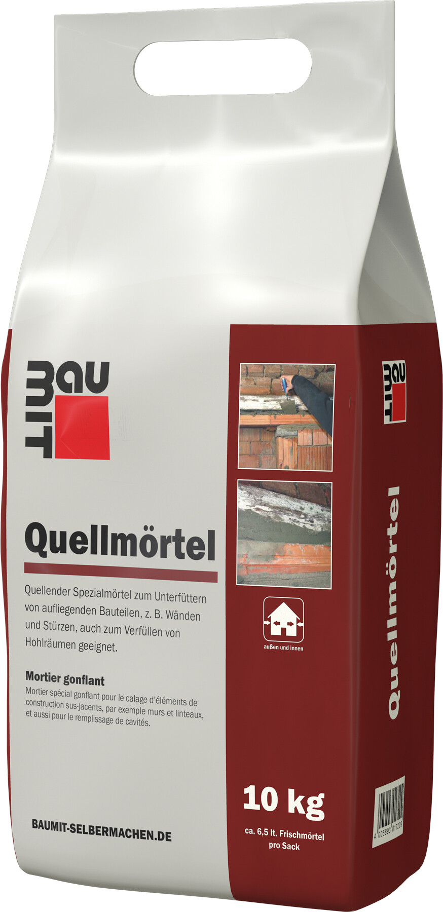 Der Baumit Quellmörtel ist ein spezieller Zementmörtel mit hoher Endfestigkeit (M10), welcher bei der Aushärtung bis zu 10 Vol% aufquillt. Dadurch kann er in schwer zugänglichen Bereichen einen kraftschlüssigen Verbund herstellen.